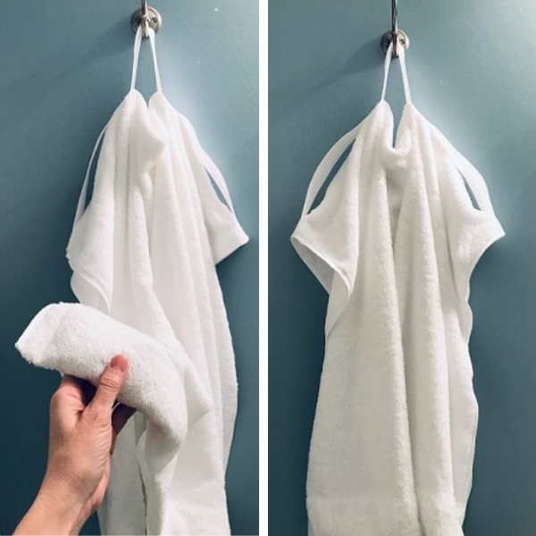 The sewn on handle is designed to grasp or slide your wrists through. There are two permanently embedded three ounce weights on one end of the towel. This allows the towel to easily drape over the legs or back providing contact with the skin so legs and back can be dried without bending or reaching. The smooth, flexible weights also allow for easy drying of your feet and toes by rubbing your feet and toes over the weights. The towel is washer and dryer safe.